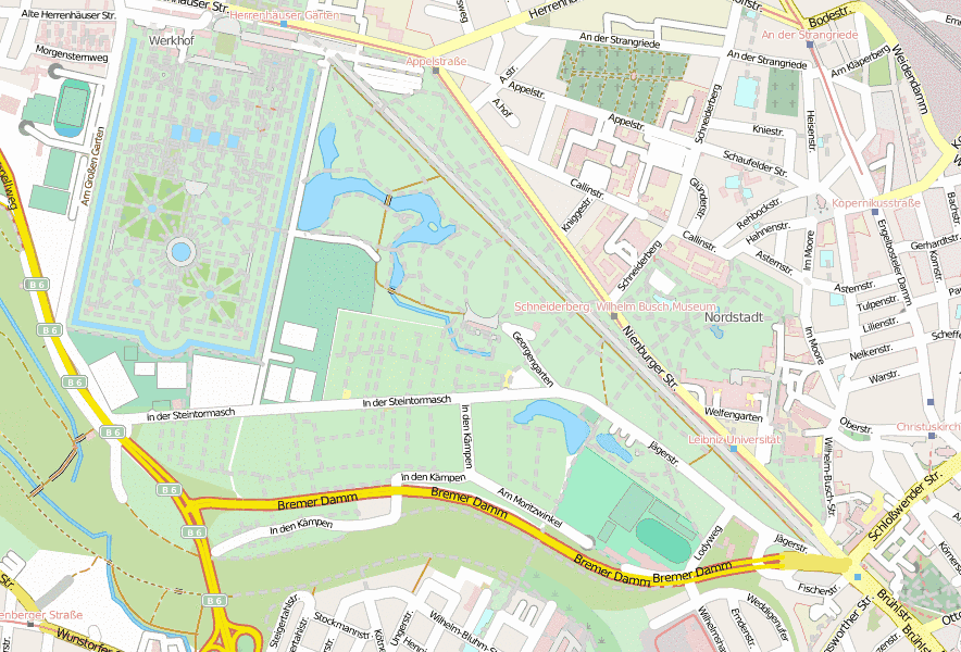 Im Umkreis findet man beliebte Attraktionen wie beispielsweise Georgengarten , Wilhelm Busch – Deutsches Museum für Karikatur und Zeichenkunst und Georgenpalais. Beliebt sind auch die folgenden Landkarten: Sprengel Museum, Zoo Hannover, Maschsee und Messegelände Hannover